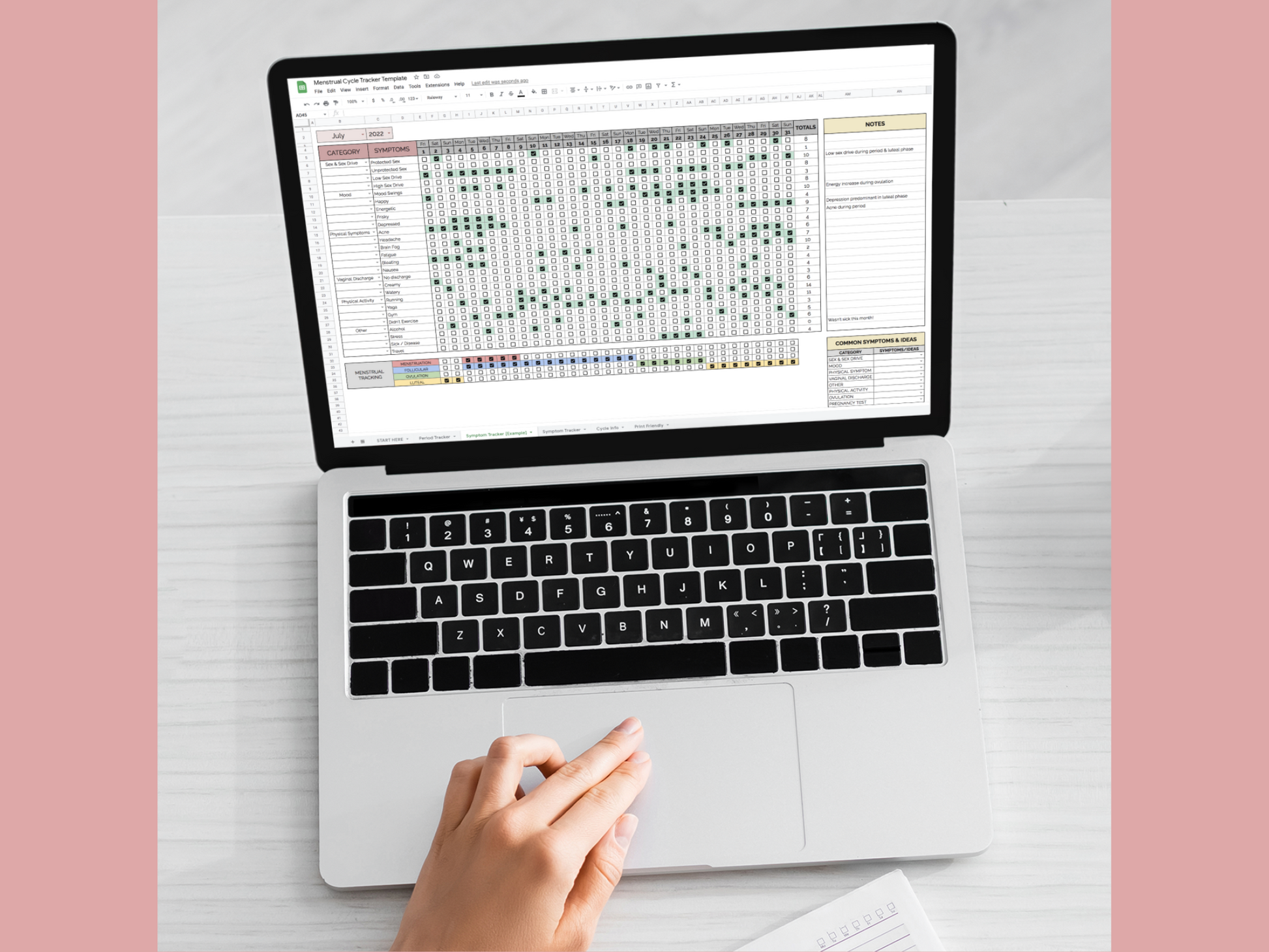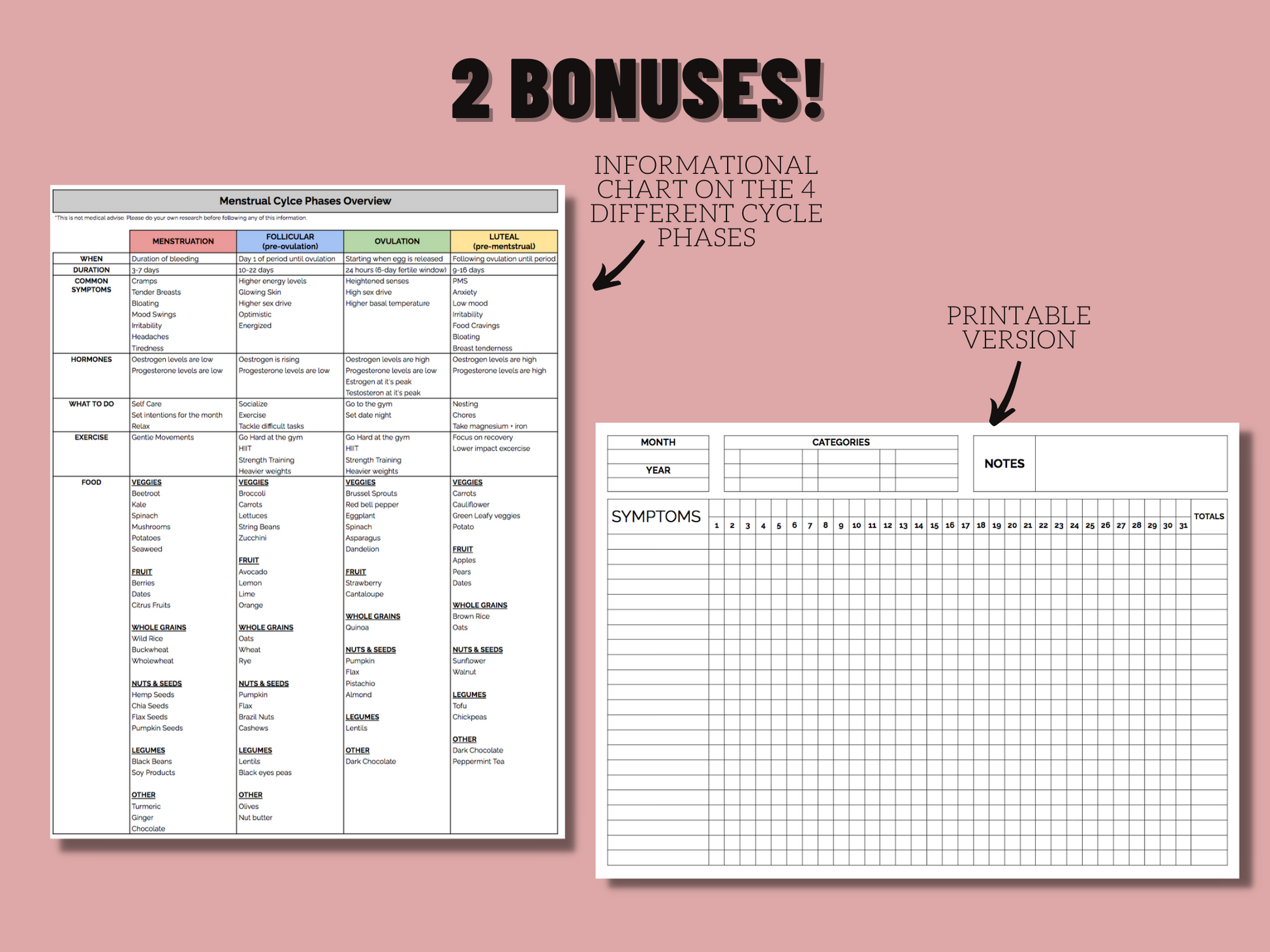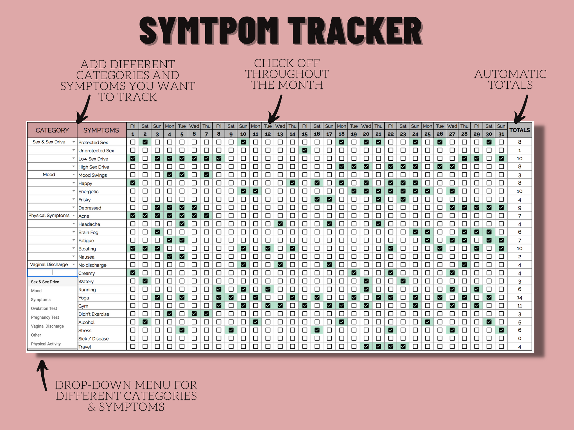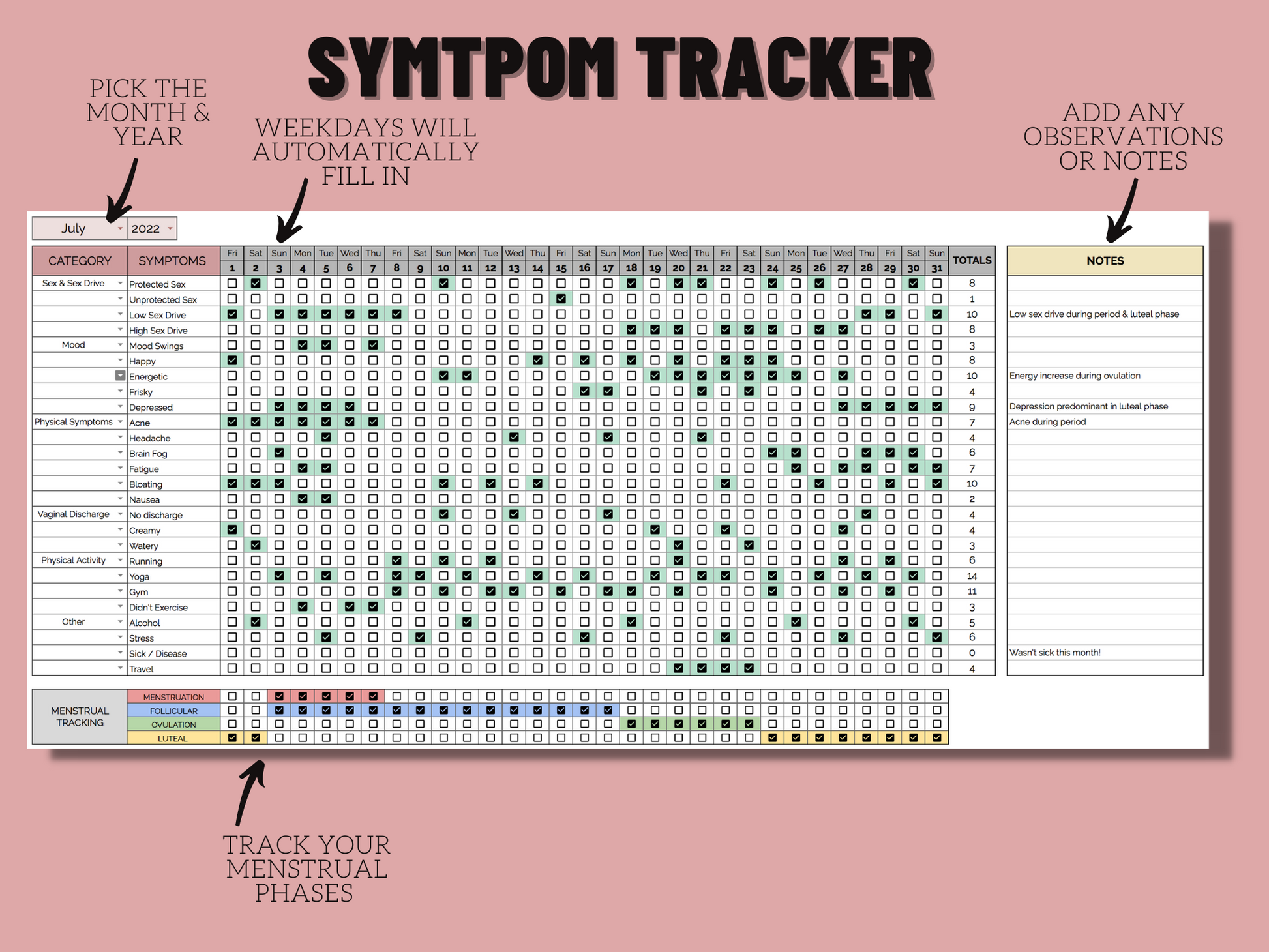 - SYMPTOM TRACKER: choose the categories & symptoms you'd like to track each month. Use the checkbox throughout the month as you experience symptoms. You can also track all 4 phases of your cycle. Add any notes, observations, and/or correlations you notice with each symptom (ex. you may get bloated during your luteal phase). The chart will also total each symptom to show you how many times you experienced it in the month.