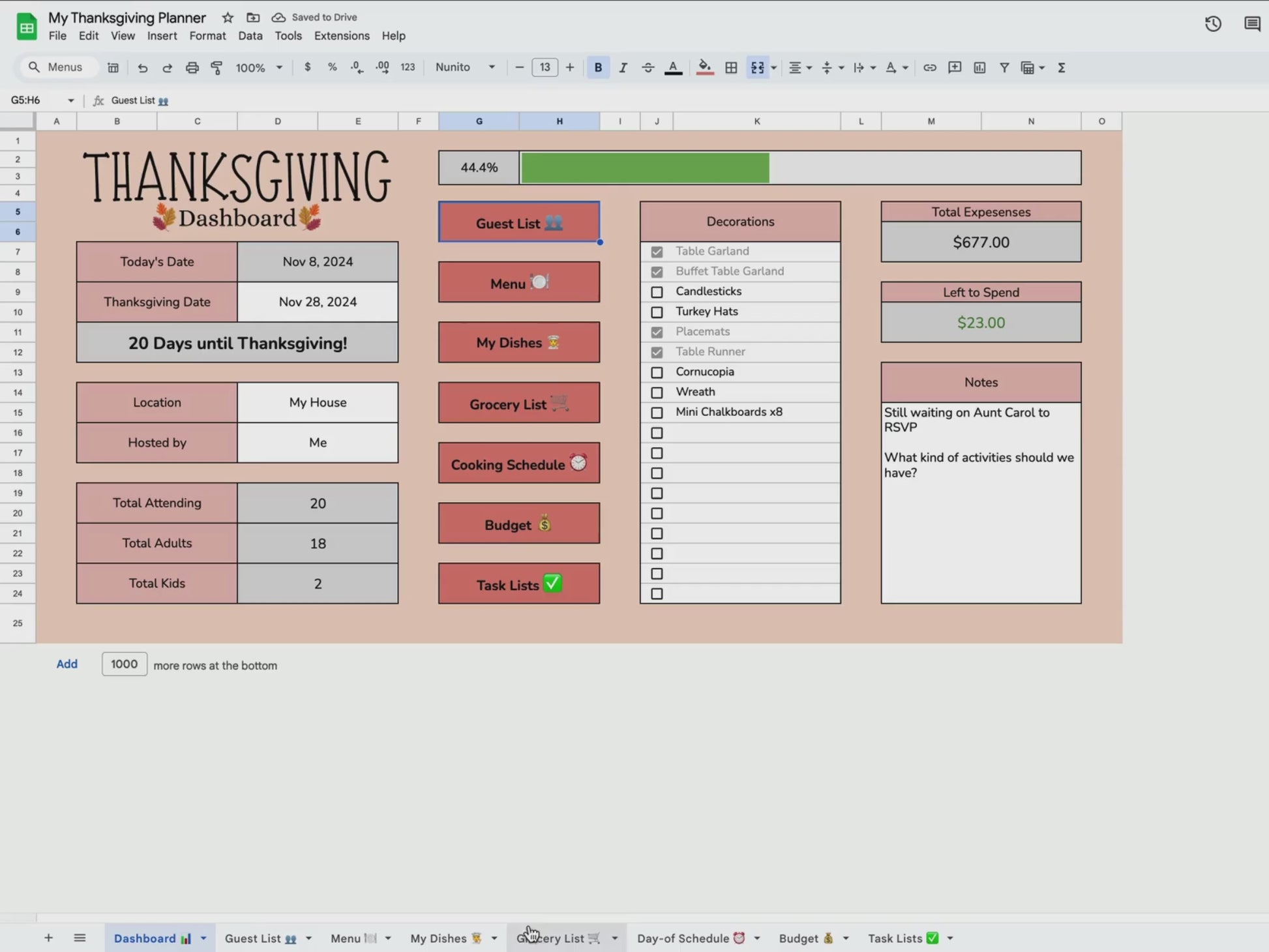- Dashboard: Your main hub with a Thanksgiving countdown, attendance summary, progress tracking, budgeting, decoration list, notes, and quick links to other tabs.