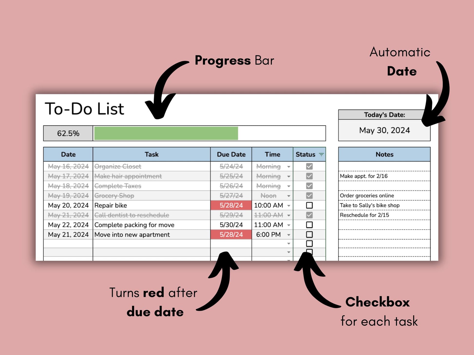 Google Sheets Compatibility: Easily accessible and customizable on any device with Google Sheets, making it simple to manage your to-do list on the go.